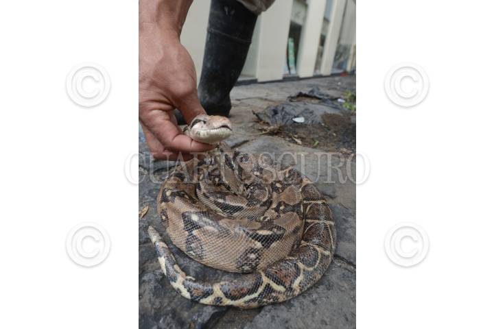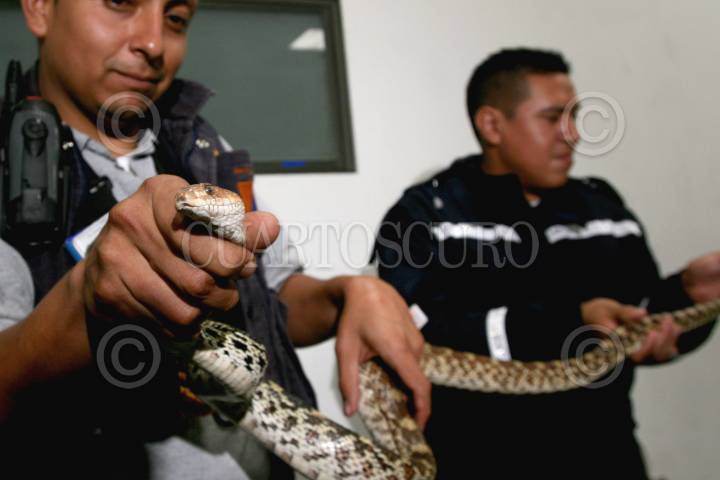 MÉXICO, D.F., 13AGOSTO2010.- Personal de Protección Civil en Benito Juárez, sostienen en sus manos una víbora Pitón de mas de metro y medio de longitud y tres kilogramos de peso que fue hallada en la vía pública sobre la calle de Xochicalco en la colonia del Valle FOTO: LUZ ACEVEDO/CUARTOSCURO.COM