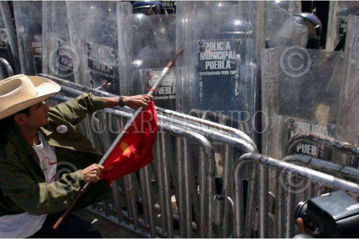 Puebla, Puebla 05 FEBRERO 2004.- Un joven activista intenta pasar la fila de granaderos, que protegían las instalaciones del centro de convenciones. Diversas organizacion sociales que se oponen al libre comercio se manifestaron contra la reunión viceministerial del ALCA. FOTO: Moisés Pablo/CUARTOSCURO.COM