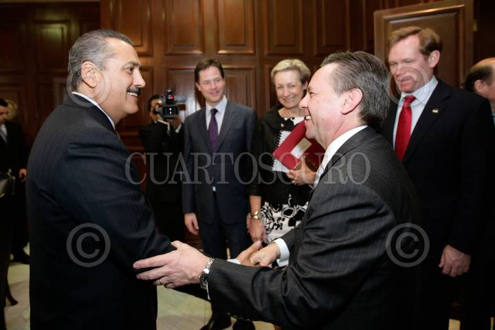 MÉXICO, D.F., 29MARZO2011.- Manlio Fabio Beltrones, presidente de la mesa directiva del Senado de la República, saluda a Eduardo Medina Mora, embajador de México en Reino Unido, durante la reunión que sostuvieron con motivo de la visita del viceministro de la Gran Bretaña, Nicholas Clegg. FOTO: CUARTOSCURO.COM