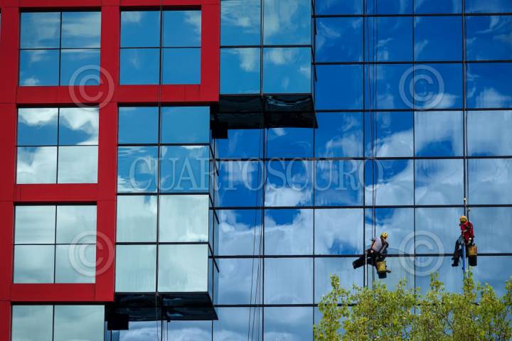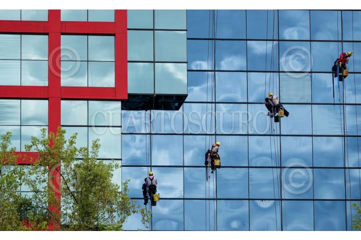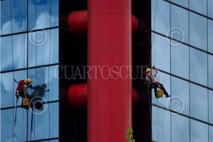 CIUDAD DE MÉXICO, 11SEPTIEMBRE2025.- Entre colores azules, verdes y rojos, los limpiavidrios del Corporativo Nacional de la Comisión Federal de Electricidad (CFE) destacan por sus utensilios amarillos. FOTO: GALO CAÑAS/CUARTOSCURO.COM