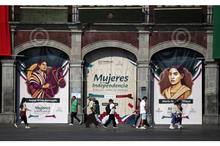 CUERNAVACA, MORELOS, 16SEPTIEMBRE2025.- Vida cotidiana en el centro de la ciudad, en la imagen, gente camina frente a pendones alusivos las Mujeres de la Independencia colgados en los portales del Palacio de Gobierno. FOTO: MARGARITO PÉREZ RETANA/CURTOSCURO.COM
