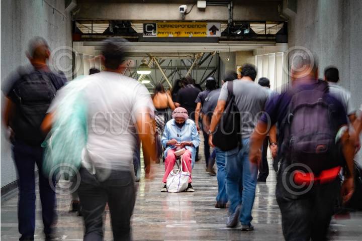 Una mujer de la tercera edad pide limosna en la estación Chabacano de la Linea 9.