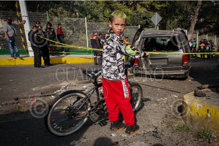 Un niño con su bicicleta se detiene frente al acordonamiento por una volcadura de un camión de bomberos.