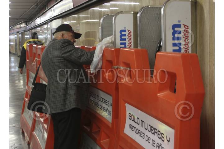 CIUDAD DE MÉXICO, 14MARZO2017.- Una persona de la tercera edad intenta usar los teléfonos públicos que se encuentran en la estación del metro Chapultepec, pero unas vallas que se usan para dividir el acceso a la área de mujeres se lo impiden. FOTO: ANTONIO CRUZ /CUARTOSCURO.COM