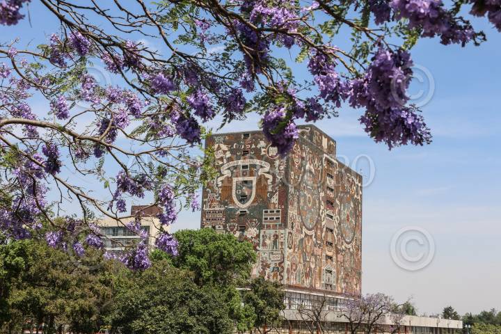 La biblioteca central, en la UNAM casi vacía y en completa calma por el paro nacional "Un día sin nosotras".