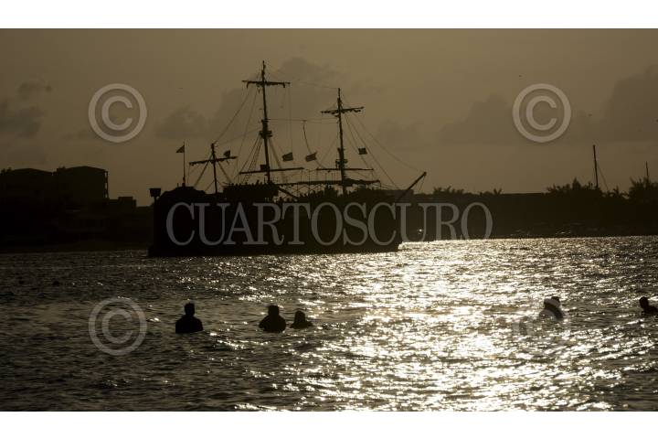 CANCÚN QUINTANA ROO, 14JUNIO2016.- Un barco turístico pasa junto a bañistas al atardecer en playa langosta. FOTO: ELIZABETH RUÍZ /CUARTOSCURO.COM