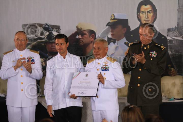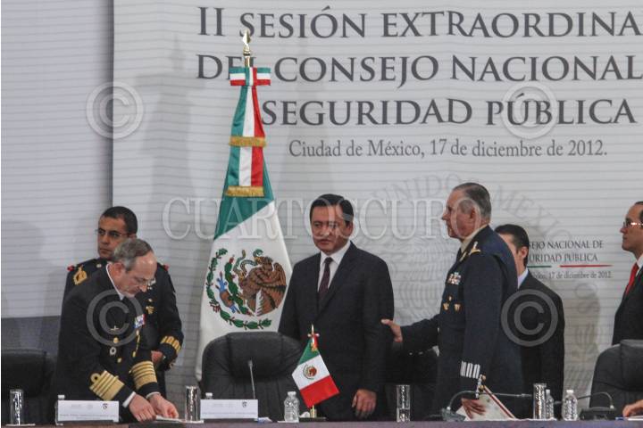 MÉXICO, D.F., 17DICIEMBRE2012.- El almirante Vidal Francisco Soberón Sanz, Secretario de Marina junto a Miguel Ángel Osorio Chong, Secretario de Gobernación y el General Salvador Cienfuegos Zepeda, Secretario de la Defensa Nacional durante la II Sesión Extraordinaria del Consejo Nacional de Seguridad Pública que tuvo lugar en Palacio Nacional. FOTO: ENRIQUE ORDÓÑEZ /CUARTOSCURO.COM