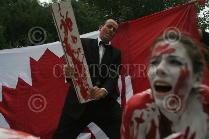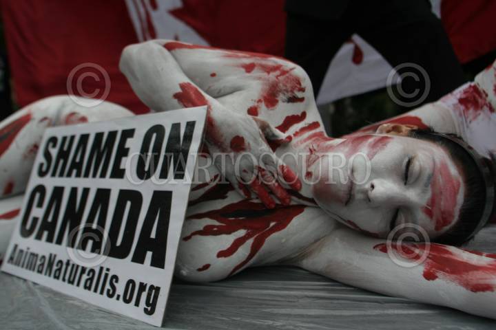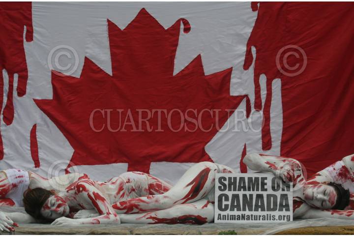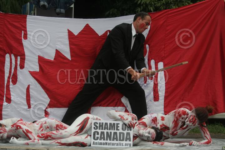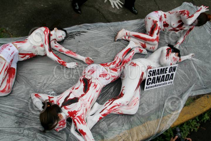 MÉXICO, D.F., 01JULIO2010.- Integrantes de la Organización AnimaNaturalis, protestaron semidesnudas a un costado de la Embajada de Canadá en el día de Canadá contra la matanza de cachorros de focas que han cobrado millones de vidas de estos animales. FOTO: ENRIQUE ORDÓÑEZ/CUARTOSCURO.COM