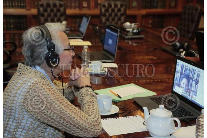 Jan Albert Hootsen, Sara Mendiola y Héctor Beristain, durante la videoconferencia de Sergio Aguayo Quezada, en CENCOS.