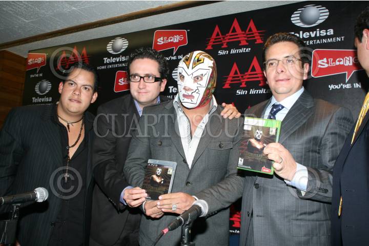 MÉXICO, D.F.,07CTUBRE2010.- Dorian Roldan, Fernando Rondón, Dr. Wagner, y Abraham Bautista, director de Slang, presentaron el videojuego "Héroes del Ring de la Triple AAA" en un famoso hotel de la Ciudad de México. FOTO: JACK GILLIAN/CUARTOSCURO.COM