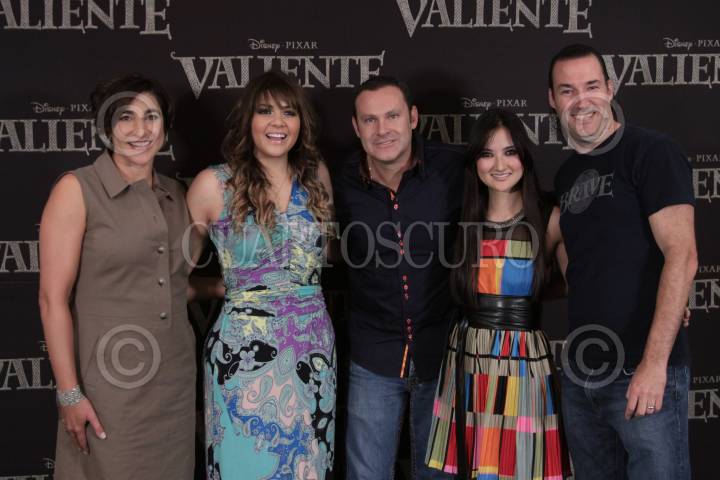 MÉXICO, D.F., 15JULIO2012.- La productora Katherine Sarafian junto a Yuridia, Alan Tacher Hiromi y Mark Andrews durante la presentación de la película VALIENTE. FOTO: IVÁN STEPHENS /CUARTOSCURO.COM