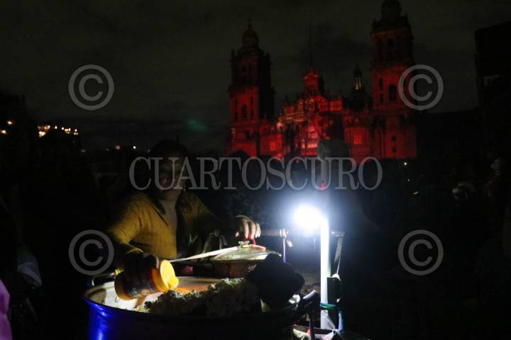 CIUDAD DE MÉXICO, 27JULIO2025.- En el marco de la fundación de los 700 años de México-Tenochtitlán, una vendedora de palomitas espera vendimia durante el último videomaping "Memoria Luminosa", que cuenta la historia de la ciudad con proyecciones en la Catedral Metropolitana. FOTO: GRACIELA LÓPEZ/CUARTOSCURO.COM