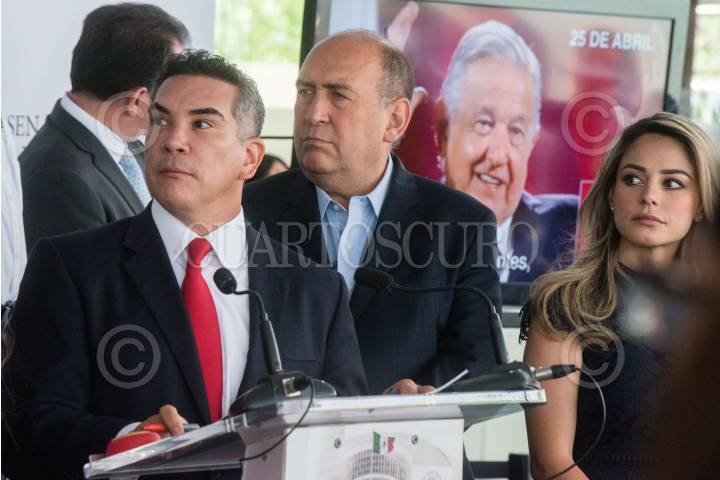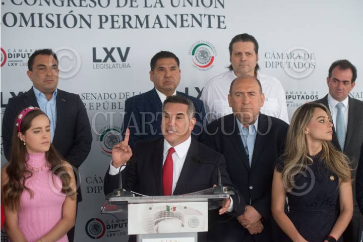 Alejandro Moreno Cárdenas, dirigente nacional del PRI, junto a Rubén Moreira, diputado y coordinador del PRI, y legisladores, ofreció conferencia de prensa para informar que la coalición "Va por México", presentará una denuncia en contra de Morena por el presunto uso de los programas sociales para condicionar el voto en las próximas elecciones.