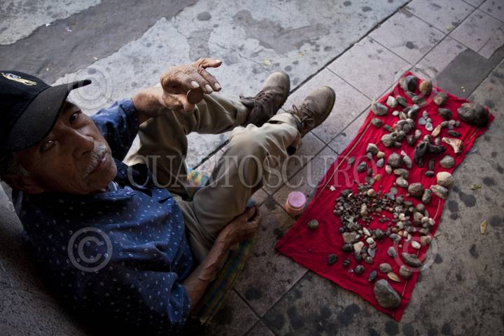 CULIACÁN, SINALOA, 25ENERO2014.-José Pesina, de 75 años, originario de Nuevo León, vende fósiles de animales, por lo regular almejas, caracoles, patas de mula y una que otra moneda antigua. Actualmente vive en el municipio de Navolato, desde hace 42 años, sin embargo, a veces va a su pueblo de origen y trae dichas piedras para sacar un poco de dinero, lo cual le servirá para comprar cacahuates y venderlos en el centro del municipio antes mencionado. Pesina no tiene un ojo ya que lo perdió por una infección, él como muchas otras personas de edad mayor, tiene que ser vendedores ambulantes para poder tener el mínimo ingreso para subsistir. FOTO: RASHIDE FRIAS /CUARTOSCURO.COM