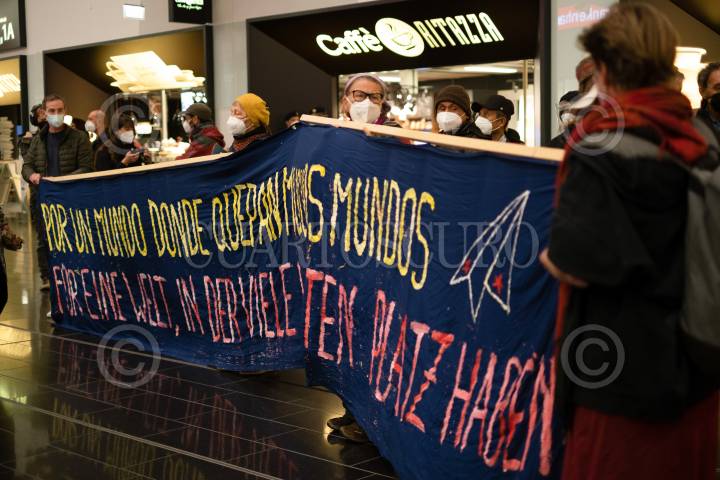 Protesta en la plaza pública Karls Platz por parte de mujeres de la comunidad somalí y colectivas feministas, en donde participaron mujeres de la Fuerza Aérea Zapatista del EZLN.