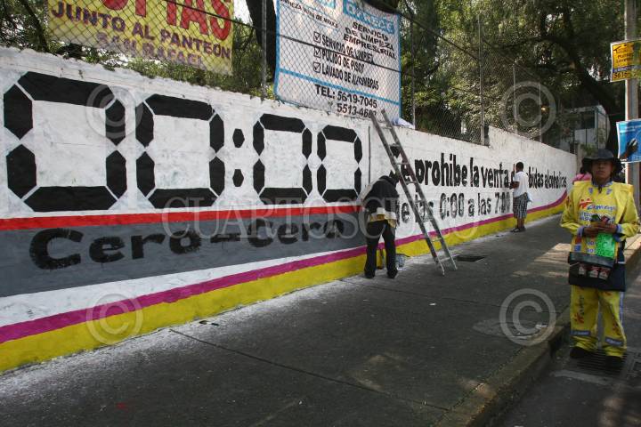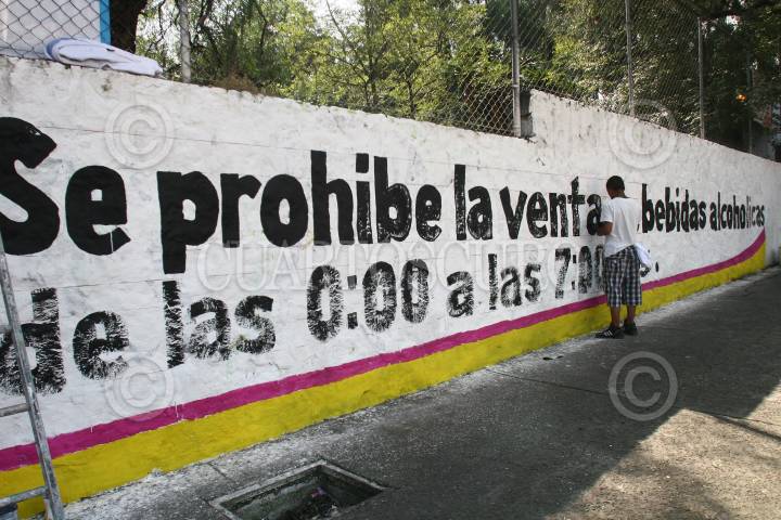 MÉXICO, D.F., 18NOVIEMBRE2009.- Trabajadores de la delegación Alvaro Obregón pintan en paredes los nuevos reglamentos delegacionales donde multaran a propietarios de tiendas de abarrotes, autoservicio, departamentales y vinaterías que vendan bebidas embriagantes de las 0:00 horas a las 7.00 horas. FOTO: SAÚL LÓPEZCUARTOSCURO.COM