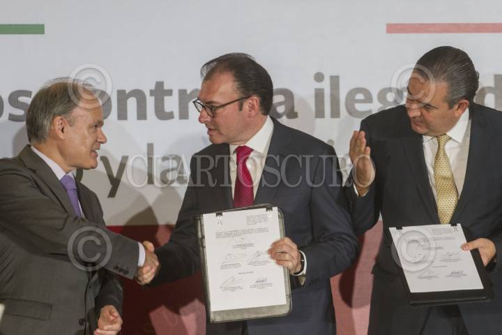 MÉXICO, D.F., 29JUNIO2015.- Ángel Abarrategui Díez, presidente de la Comisión para la Industria de Vinos y Licores, Luis Videgaray, secretario de Hacienda, y Gerardo Gutiérrez Candiani, presidente del Consejo Coordinador Empresarial, durante el lanzamiento de la campaña "Juntos contra la Ilegalidad". FOTO: ISAAC ESQUIVEL /CUARTOSCURO.COM