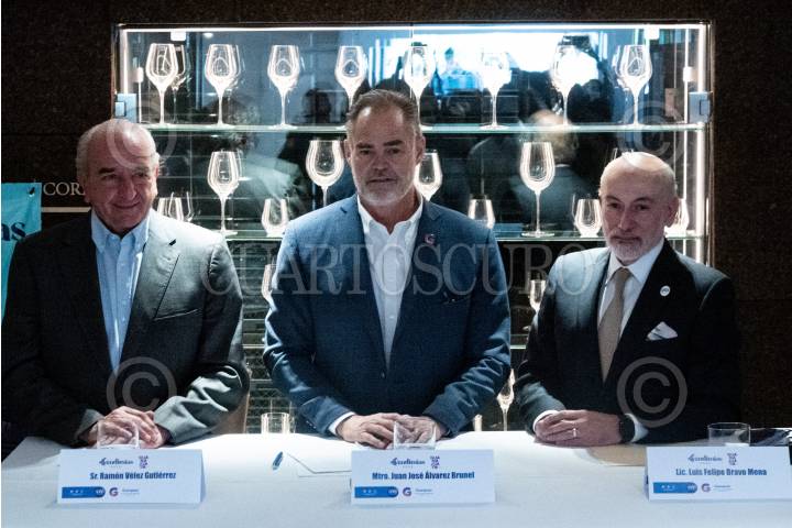 Ramón Vélez Gutiérrez, Juan José Álvarez Brunel y Luis Felipe Bravo Mena durante la conferencia de prensa de las Fiestas de la Vendimia 2o22 de Guanajuato.