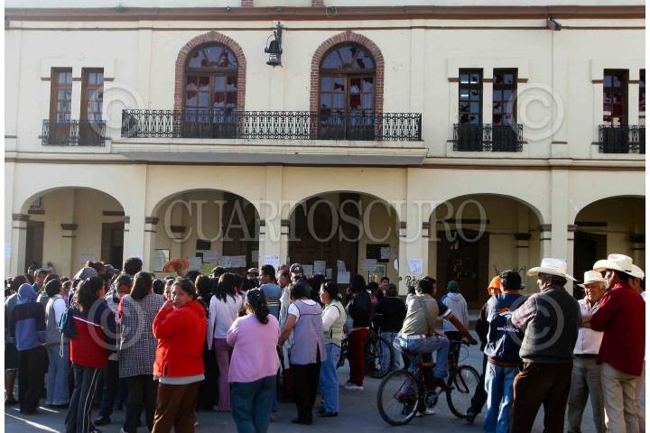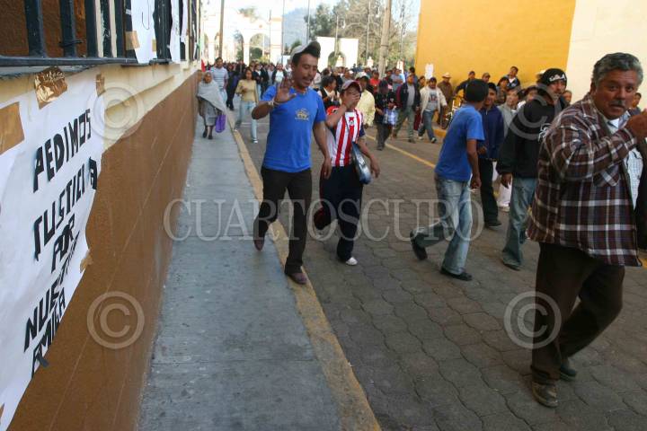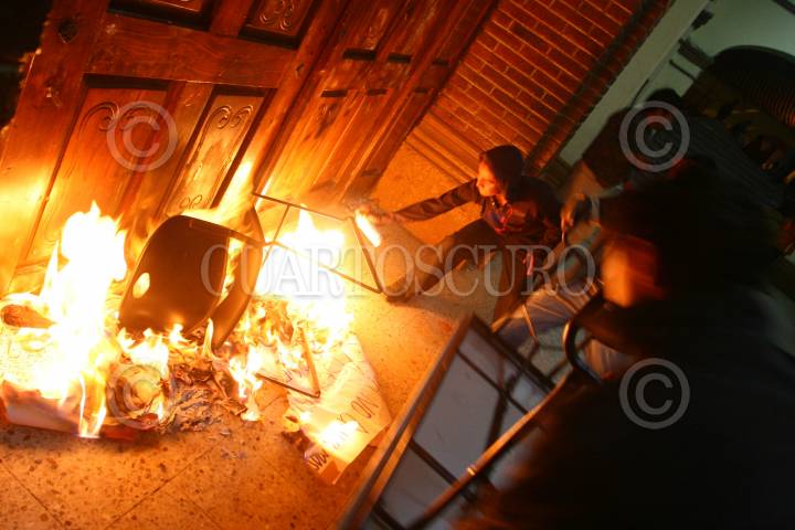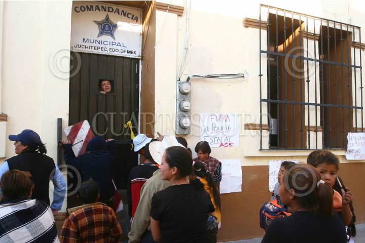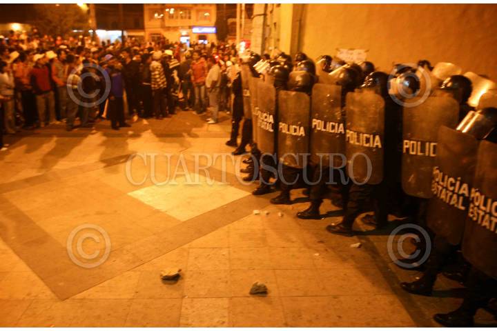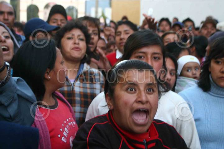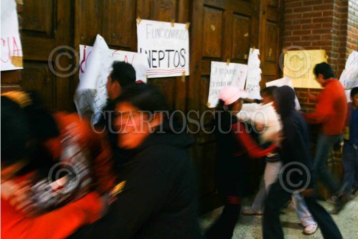 JUCHITEPEC, ESTADO DE MÉXICO, 05DICIEMBRE2008.- Habitantes de Juchitepec enardecidos por la violacion y muerte de una jovencita de 14 años de edad, salieron a exigir a las autoridades se haga justicia. Los inconformes retuvieron por algunas horas al edil, lo apedrearon y le lanzaron huevos, despues de lo sucedido intentaron quemar la presidencia municipal, minutos despues granaderos del ASE se enfrentaron contra los habitantes y los desalojaron con gas lacrimogeno. FOTO: SAUL LOPEZ/CUARTOSCURO.COM