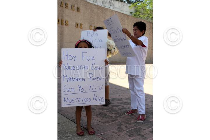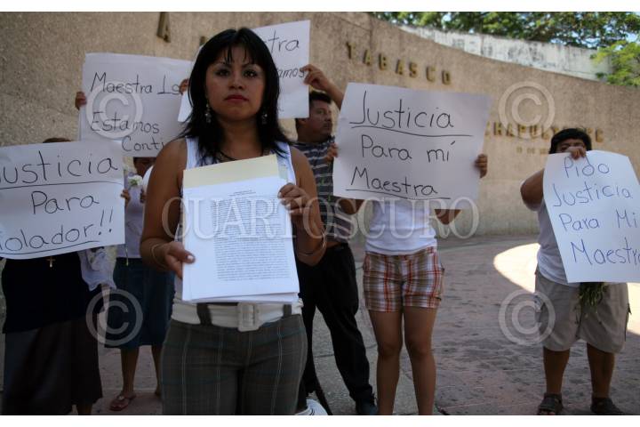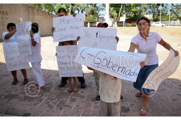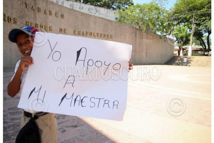 VILLAHERMOSA, TABASCO, 11JUNIO2009.- Niños junto con sus padres, acudieron al monumento a los Niños Héroes para mostrar carteles en apoyo a su maestra Maribel Martínez González, quien fue violada sexualmente por el líder del Sindicato Independiente de Trabajadores de la Educación en Tabasco (SITET); Roger Arias, quien tras golpear a la educadora la introdujo a la fuerza a un motel. FOTO: MARCO POLO GUZMÁN HERNÁNDEZ/CUARTOSCURO.COM