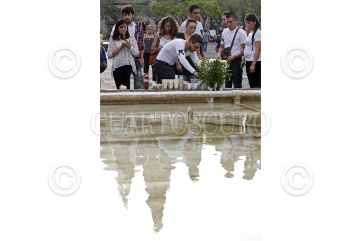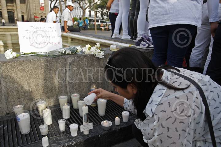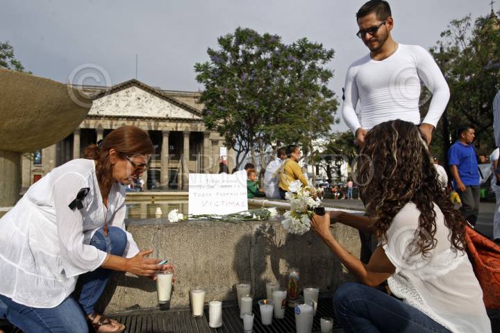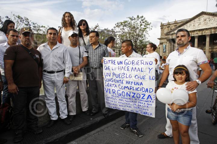 GUADALAJARA, JALISCO. 13ABRIL2015.- Esta tarde en la Plaza de la Liberación Policías del Estado protestaron para exigir Paz, al mismo tiempo realizaron un pequeño homenaje a los 15 policías de la Fuerza Única que fueron emboscados el pasado lunes 6 de abril en San Sebastián del Oeste, al haber sido victimas de la violencia en México. FOTO: FERNANDO CARRANZA GARCIA / CUARTOSCURO.COM