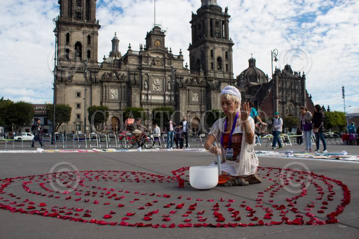 Una mujer crea sonidos con un cuenco cantor durante la instalación de la Manta de la Curación en el Zócalo Capitalino