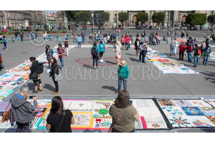 Mujeres instalaron la Manta de la Curación en el Zócalo Capitalino, con el fin de generar conciencia sobre los hechos de violencia en el país
