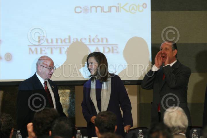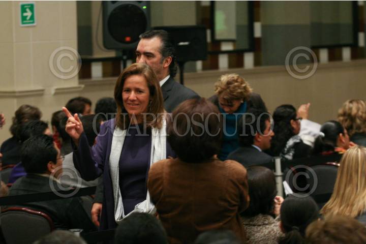 MÉXICO D.F., 08FEBRERO2010.- Margarita Zavala, esposa del presidente de México, acompañada de Isaac Moscatel, Director de Alianza Educativa Eureka, Rogelio Casas y Jaime Salinas, acudió a la ceremonia de Inauguración del Congreso de Innovación Educativa 2010 y en la cual participo con una ponencia. Durante su ponencia retomo las palabras de su esposo, al mencionara “que hay que hablar bien de México” y lamento los actos violentos que se viven en el país, tomando como ejemplo el caso del futbolista, Salvador Cabañas. FOTO: GUILLERMO PEREA/CUARTOSCURO.COM