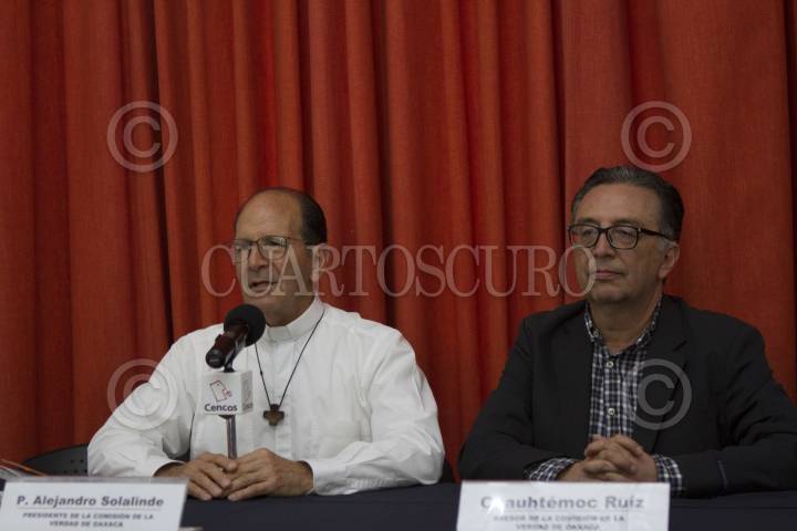 MÉXICO, D.F., 11JUNIO2015.- El padre Alejandro Solalinde y Cuauhtémoc Ruiz, integrante y asesor de la Comisión de la Verdad de Oaxaca, respectivamente, quienes investigan los hechos que motivaron las violaciones a los derechos humanos del pueblo de Oaxaca en el 2006 y el 2007, la cual sesionará el 14 de junio en el Teatro Macedonio Alcalá. FOTO: MOISÉS PABLO /CUARTOSCURO.COM