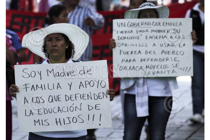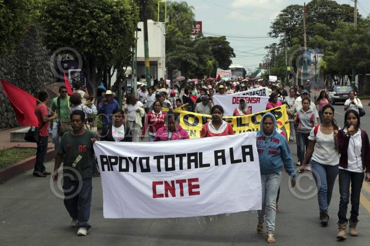 CUERNAVACA, MORELOS, 22JUNIO2016.- Estudiantes de la Normal Femenil Emiliano Zapata de Amilcingo, maestros y habitantes del estado marcharon este día para protestar por los hechos ocurridos el pasado 19 de junio en Nochixtlán, Oaxaca. Exigieron que la reforma educativa que impulsa el gobierno federal sea consensuada con el magisterio antes que ser impuesta por medio de la represión y la violencia. FOTO: MARGARITO PÉREZ RETANA /CUARTOSCURO.COM