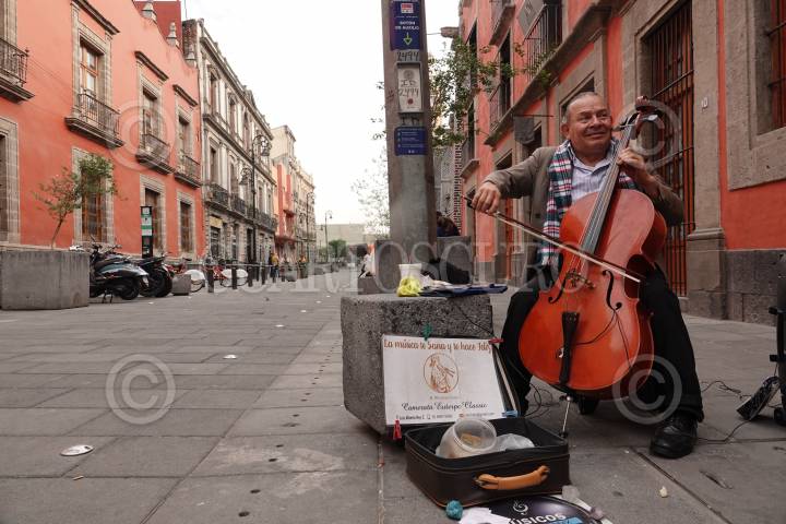 Un violonchelista toca unas melodías a cambio de unas monedas en el Centro Histórico