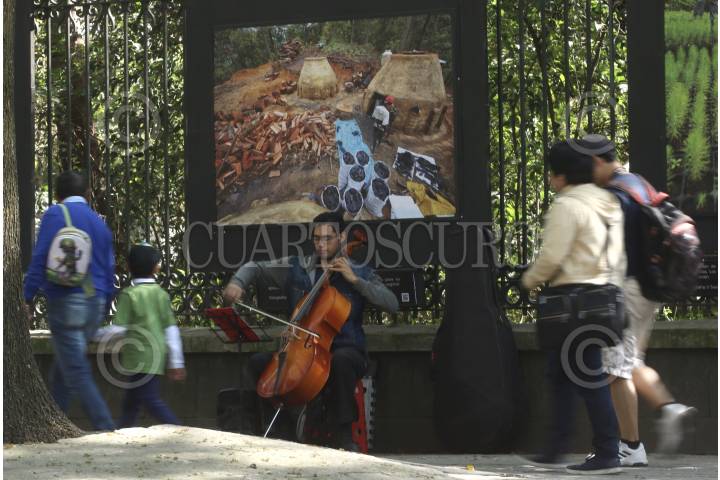 CIUDAD DE MÉXICO, 01DICIEMBRE2019.- Un violonchelista, toca frente a las rejas de Chapultepec, mientras transeúntes lo observan en Paseo de la Reforma. FOTO: ROGELIO MORALES /CUARTOSCURO.COM