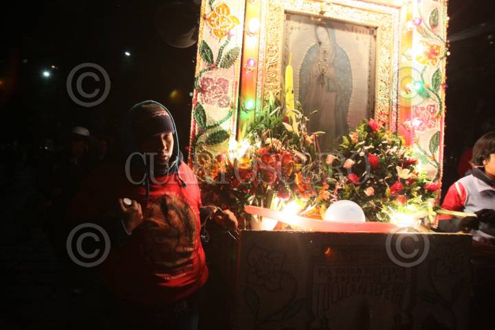 MORELIA, MICHOACAN, 12DICIEMBRE2012.- Como cada 12 de diciembre, miles de peregrinos recorren la calzada de Fray Antonio de San Miguel para terminar su peregrinación y agradecer a la Virgen de Guadalupe en el Templo de San Diego. FOTO: ALÁN ORTEGA /CUARTOSCURO.COM