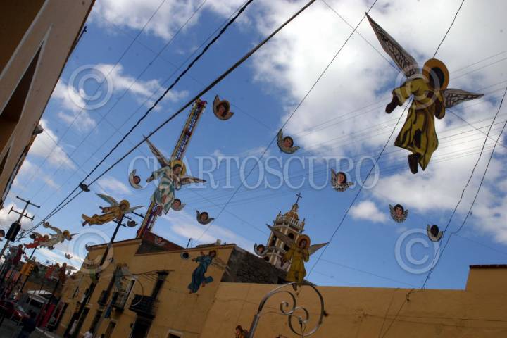 Huamantla, Tlaxcala, 14AGOSTO2004.- La calles de los alrededores del santuario de la Virgen de Santa María de la Cariadad, se comezaron a adornar para que en la noche reciban la procesión. Mañana las calles lucen ataviadas de alfombras multicolores, que son la tradición de los festejos de Huamantla. FOTO: Moisés Pablo/CUARTOSCURO.COM