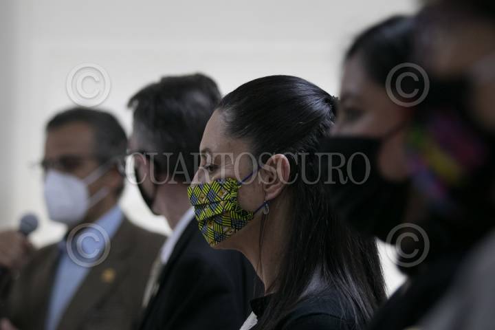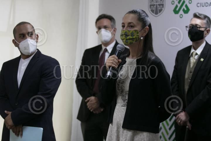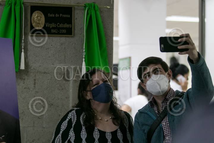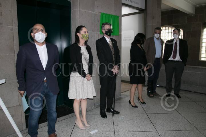 Rubén Caballero Casillas, hijo de Virgilio Caballero; Alfonso Suárez del Real; Claudia Sheinbaum e Irma Eréndira Sandoval durante la develación de la placa de la Sala de Prensa "Virgilio Caballero" con motivo del Día del Periodista.