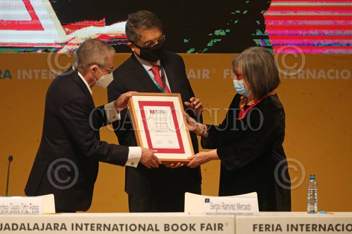 Enrique Ibarra Secretario General del Estado y el Escritor Sergio Ramírez Mercado, entregaron premio FIL de Literatura en Lenguas Romances a Diamela Eltit escritora Chilena premio FIL de Literatura en Lenguas Romances, esto durante la ceremonia de Inauguración de la edición 35 de la Feria Internacional del Libro de Guadalajara (FIL) en Expo Guadalajara y en donde Perú es el país invitado de honor.