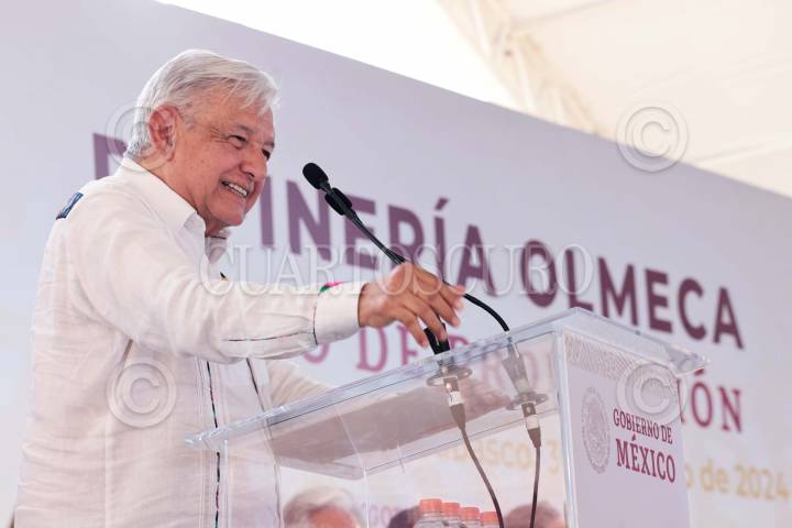 DOS BOCAS PARAÍSO, TABASCO, 03AGOSTO2024.- Andrés Manuel López Obrador, presidente de México, durante su intervención en el inicio de producción de la refinería Dos Bocas “Olmeca”. FOTO: PRESIDENCIA/CUARTOSCURO.COM
