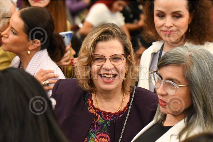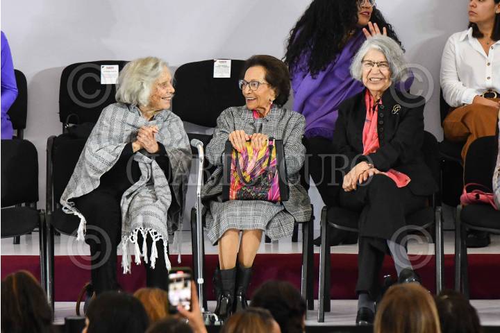 CIUDAD DE MÉXICO, 25JUNIO2024.- Elena Poniatowska, escritora; Ifigenia Martínez, senadora federal, y Silvia Torres, astrónoma, durante el evento "Con Claudia llegamos todas" encabezado por Claudia Sheinbaum, virtual presidenta electa, en el patio principal de la Universidad del Claustro de Sor Juana. FOTO: MARIO JASSO/CUARTOSCURO.COM