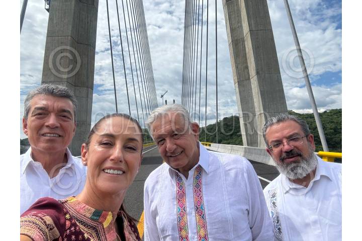 LA CONCORDIA, CHIAPAS, 02AGOSTO2024.- Claudia Sheinbaum, virtual presidenta electa, compartió una fotografía en el puente de La Concordia junto a Rutilio Escandón, gobernador de Chiapas, Andrés Manuel López Obrador, presidente de México y Jorge Nuño, secretaria de Infraestructura, Comunicaciones y Transportes. FOTO: PRENSA CLAUDIA SHEINBAUM/CUARTOSCURO.COM