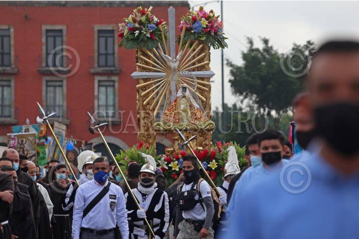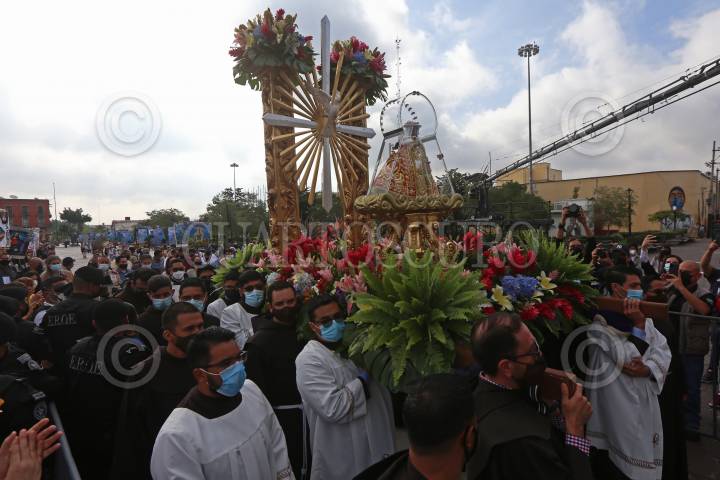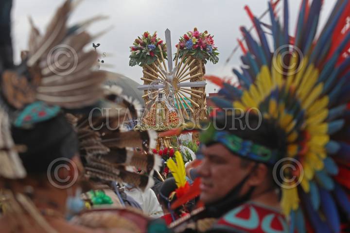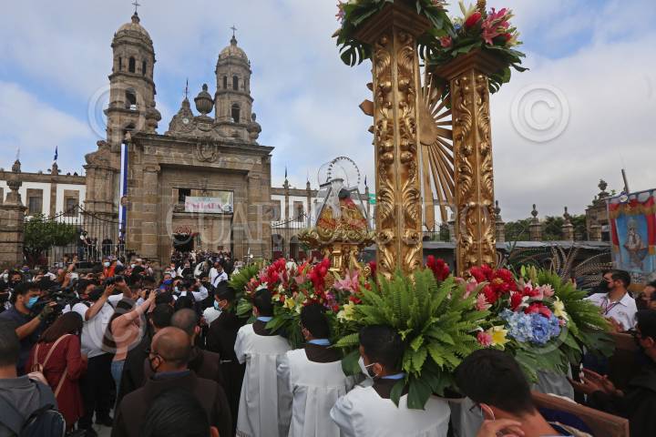 La Virgen de Zapopan ante la mirada de un pequeño numero de danzantes que la acompañaron durante el recorrido, arribó a la plancha principal de la Plaza de la Américas, justo antes de entrar a su recinto, La Basílica de Zapopan,