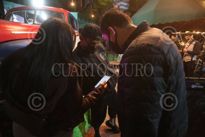 Una joven muestra su certificado de vacunación a los guardias a la entrada de un establecimiento ubicado en la zona del andador Chapultepec.