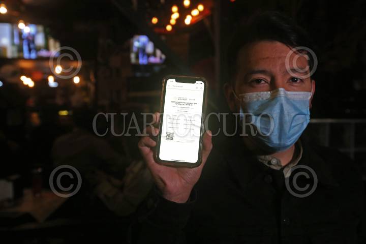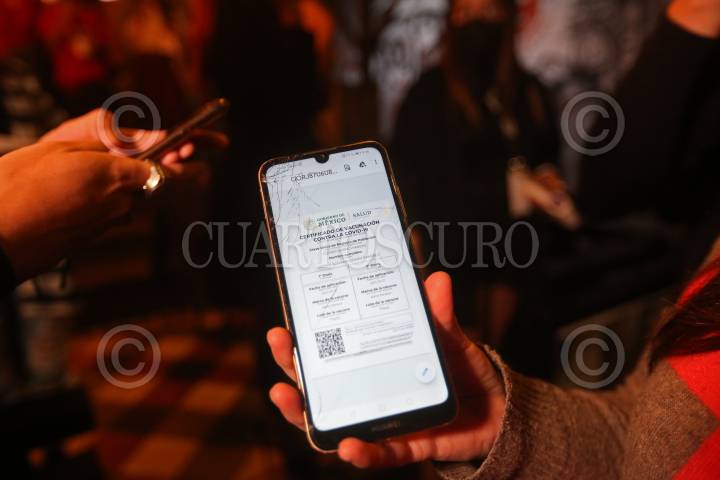 Una joven muestra su certificado de vacunación en la entrada de un establecimiento ubicado en la zona del andador Chapultepec.