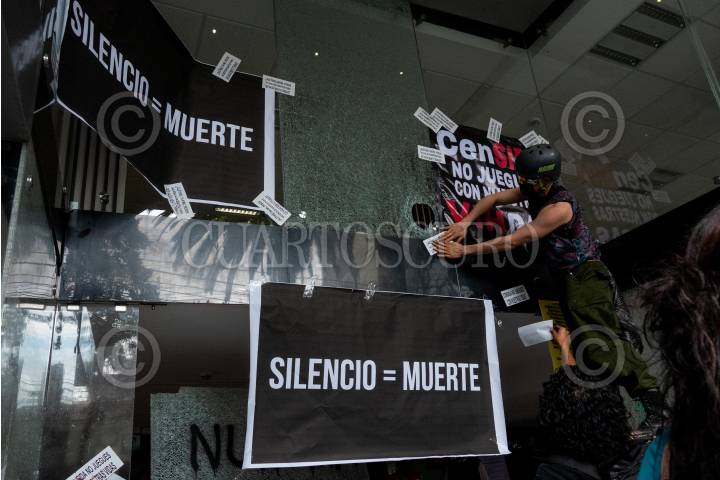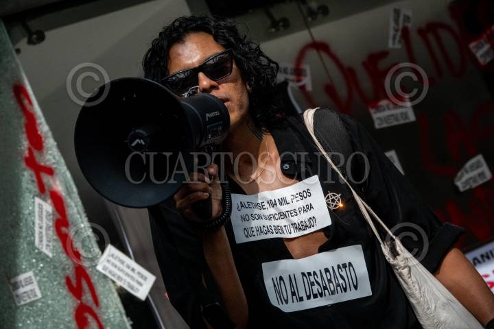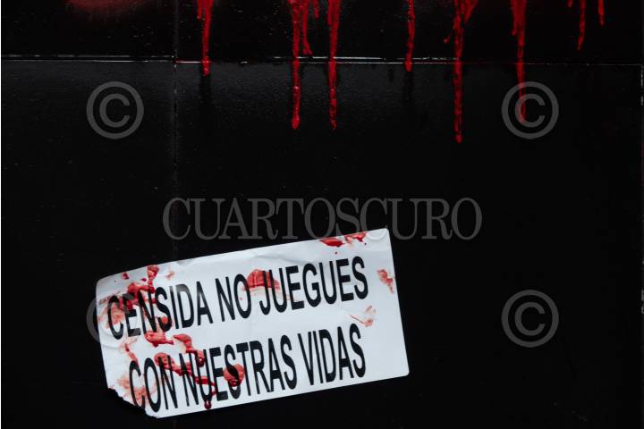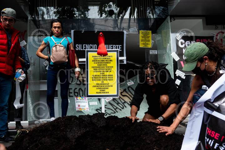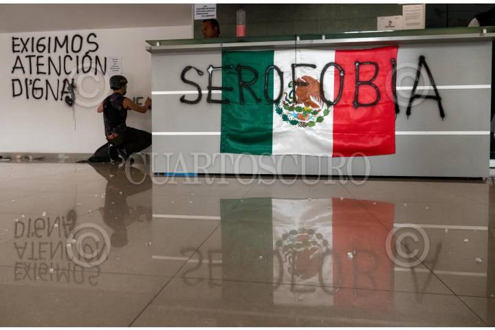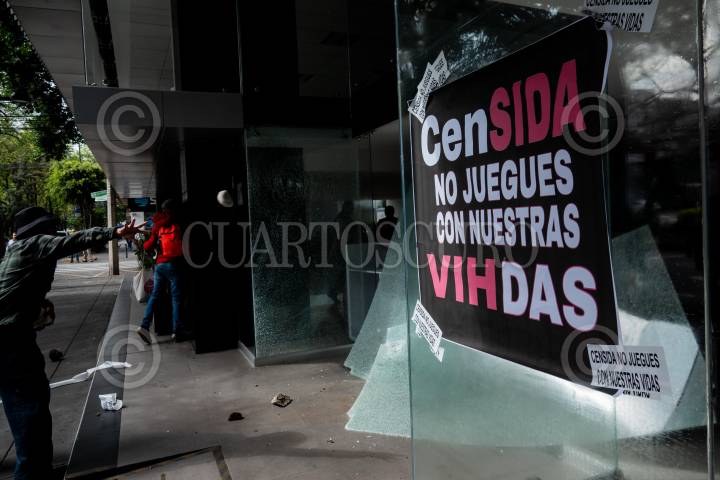 CIUDAD DE MÉXICO, 01DICIEMBRE2023.- Integrantes de la comunidad LGBTTTIQPA+ e integrantes del Colectivo VIHve Libre se manifestaron en las oficinas de la Secretaría de Salud en Polanco, sede del Centro Nacional para la Prevención y el Control del VIH/SIDA (CENSIDA), para exigir a su titular Alethse De la Torre Rosas atención inmediata y accione para erradicar el desabasto de medicamentos y atención a la población con VIH, en el marco del Día Mundial de la Lucha contra el Sida. Encabezados por el activista Alaín Pinzón, las y los inconformes realizaron pintas y pegaron afiches para la visibilización de la lucha. Actualmente, se cuenta con un registro de 365 mil 916 personas en el país que viven con el virus. FOTO: GALO CAÑAS/CUARTOSCURO.COM