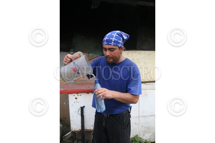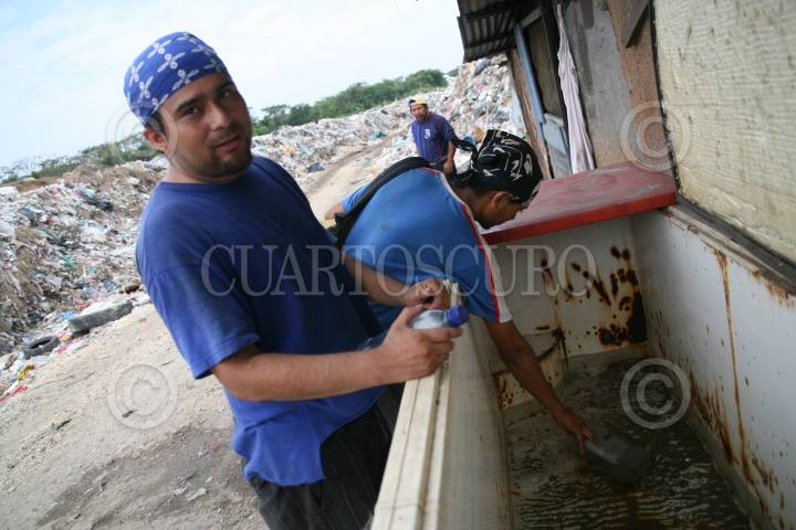 TENOSIQUE, TABASCO, 15ABRIL2010.- Un par de indocumentados oriundos de Honduras que dijeron llamarse Jaime Javier Ulloa y Joel Acosta informaron dejar su país debido a la pobreza extrema que atraviesa su país, por lo que se arriesgan cruzando otras fronteras para llegar a los E.U. Indican llevar cinco días en su travesía y que se enfrentan a demasiados situaciones de miedo; llegaron sedientos y toman una garrafa de agua que estaba acumulada en una vieja nevera sobre el ejido Rancho Grande. FOTO: MARCO POLO GUZMÁN HERNÁNDEZ/CUARTOSCURO.COM