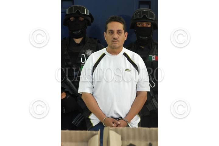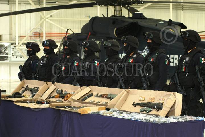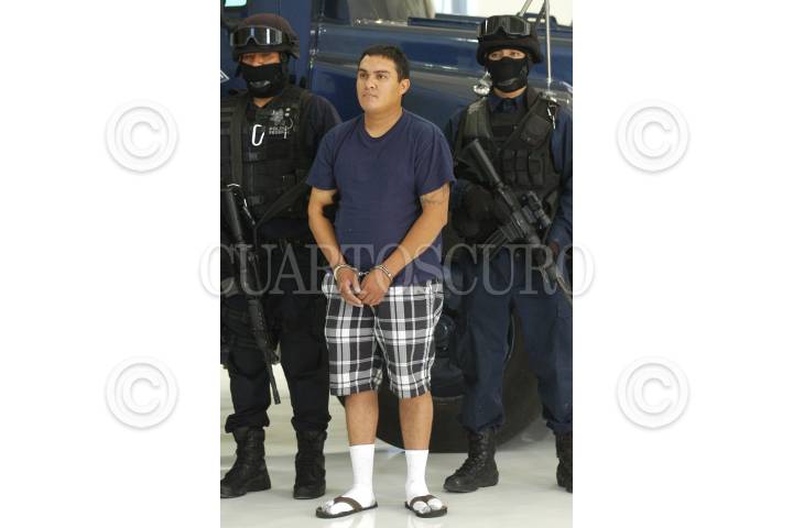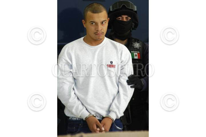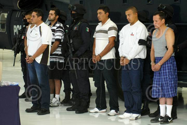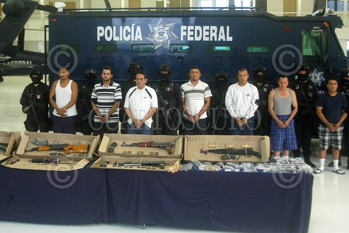 MEXICO, D.F., 02JULIO2010.- Elementos de la policía Federal, presentaron a siete sujetos como presuntos integrantes de “La Línea” detenidos en Ciudad Juárez Chihuahua. Entre estos figura Jesús Ernesto Chávez Castillo, Alias “El Camello”, encargado de la logística y de proveer de armas a esta banda delictiva. Este mismo indico que estos fueron los encargados del atentado en contra de la funcionaria del Cónsul estadounidense ya que no quiso facilitar visas a inmigrantes en este vecino país. FOTO: LUIS CARBAYO/CUARTOSCURO.COM