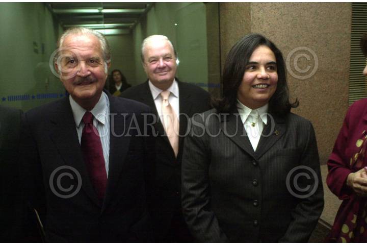 México D.F, a 16FEB2004.- El escritor Carlos Fuentes junto con Consuelo Saizar directora general del Fondo de Cultura Económica y Claudio Landucci a su llegada a la presentación del libro "Viendo Visiones". FOTO: Eunice Adorno/CUARTOSCURO.COM