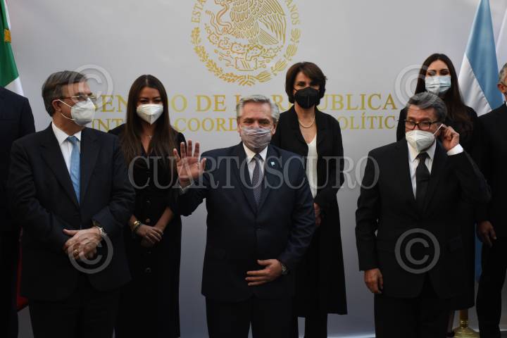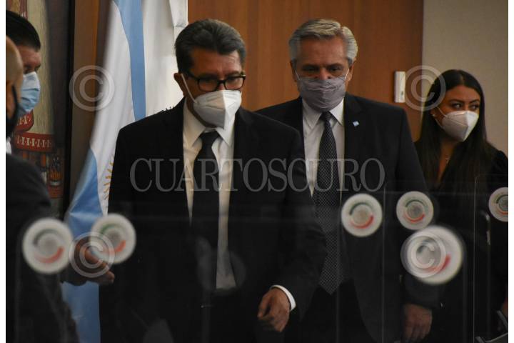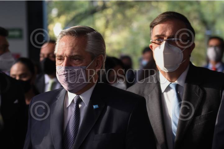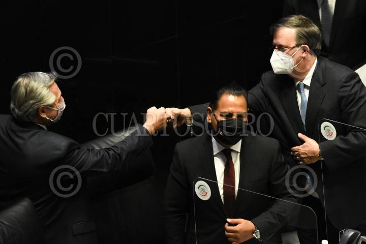 Alberto Fernández, presidente de Argentina y Marcelo Ebrard, canciller mexicano, llegan al Senado de la República.