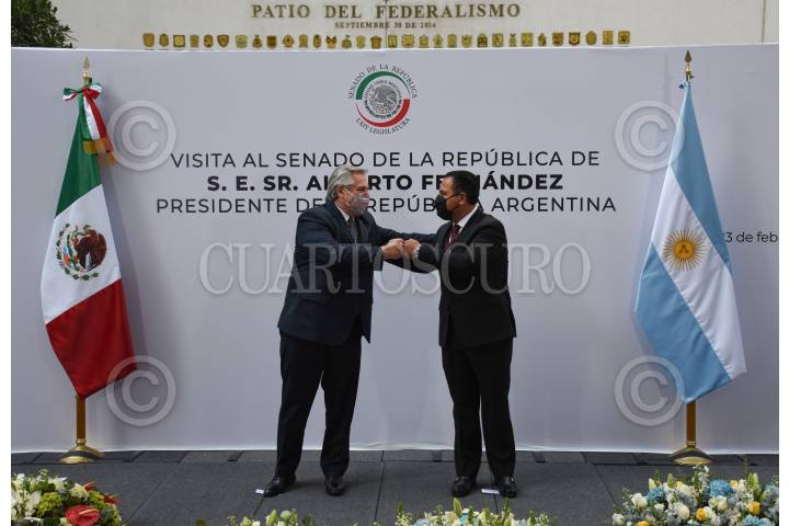 Alberto Fernández, presidente de Argentina, saluda a Eduardo Ramírez, presidente de la Mesa Directiva del Senado, a su llegada a la Cámara Alta.