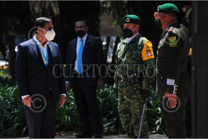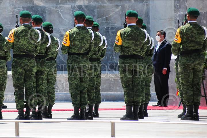 Luis Arce Catacora, presidente de Bolivia, es custodiado por elementos del ejército durante su visita al Monumento a los Niños Héroes.