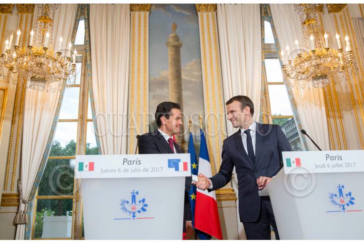 PARÍS, FRANCIA, 06JULIO2017.- El Presidente de México, Enrique Peña Nieto, sostuvo un encuentro con su homólogo francés, Emmanuel Macron, en el marco de la Visita de Trabajo que el Mandatario mexicano realizó a París, en el que dialogaron en torno a diversos temas de la relación bilateral y de la agenda global. FOTO: PRESIDENCIA /CUARTOSCURO.COM